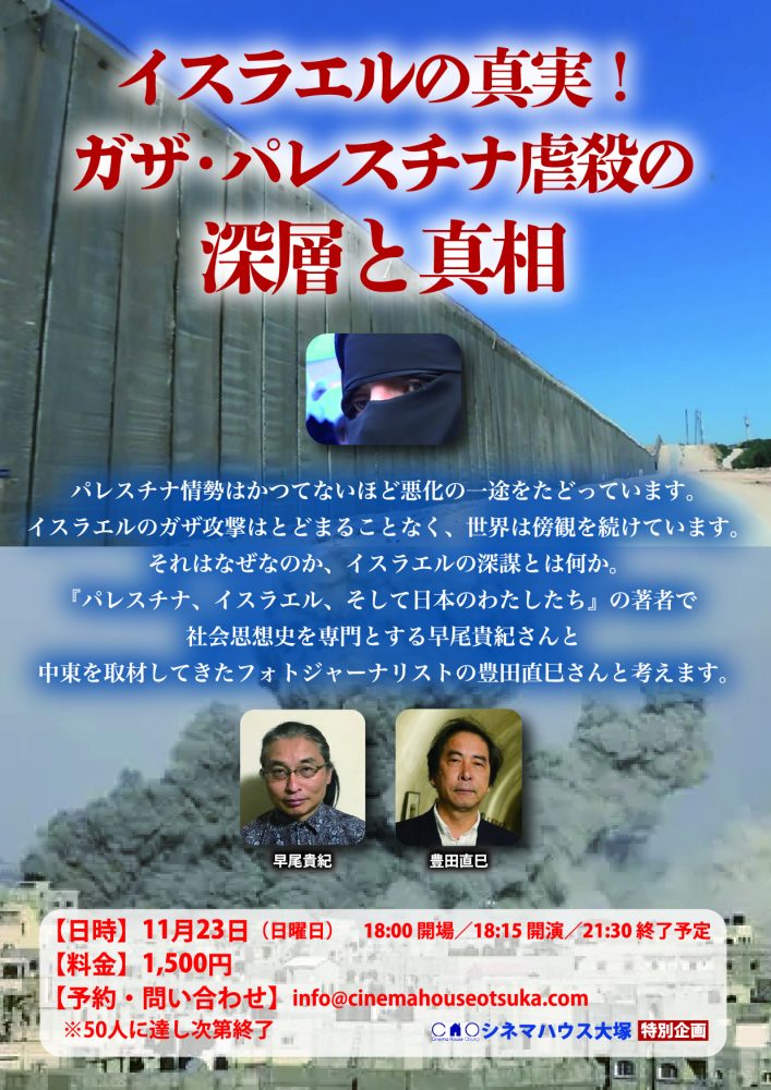 coming soon 映画『東京ランドマーク』 自主上映会&トークイベント 10月4日(土)15:00 〜(開場 14:30 ) 終了 17:00予定(トークイベント含む) 詳細はこちらをクリック 『聖夜サイレントナイト』上映会 10月4日18時開場 速やかに開映 詳細はこちらをクリック 「極彩色肉筆絵巻 座敷牢」 東京大塚上映 10月5日(日曜日) 14時 18時 (入れ替え制) 詳細はこちらをクリック 『イスラエルの真実!ガザ・パレスチナ虐殺の深層と真相』講座・トーク・上映 11月23日(日)18時開場 18時15分から上映・講座・クロストーク 21時半までの予定 詳細はこちらをクリック