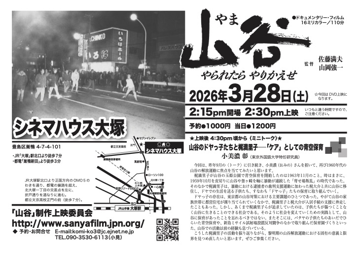 連続上映『山内ケンジの非道徳(インモラル)な世界』 1月16日から18日まで。14時30分から毎日3作品上映と監督とゲストのトークあります。 『水の中の彼女』上映会 1月11日(日曜日)13時開映 15時30分開映の2回上映 パレスチナ「私たちに何ができるのかーNGOに聞く、どうする?ガザの人道支援」 12月17日(水)17時30分開場。18時開演。21時終了予定。 LOVE STORY~恋する女達~舞台挨拶付き上映 12月12日(金)13時、16時、19時の3回、上映と舞台挨拶。13日(土)15時、18時の2回、上映と舞台挨拶 五代高之トークショー 2025年12月6日(土)14:30開場/15:00開演 終了予定17:30 原將人ミュージックデイ 12月1日(月曜日)11時半開場。12時「あなたにゐてほしい~SOAR~」。14時「女生徒1936」。 16時「未帰還の友へ」。トークショー 18時~21時 初国知所之天皇スーパーハツクニ 喜劇事件presents第1回映画祭『終わりの始まり』 11月30日(日)第1回上映11時30分。第2回上映15時30分。入場無料。 『イスラエルの真実!ガザ・パレスチナ虐殺の深層と真相』講座・トーク・上映 11月23日(日)18時開場 18時15分から上映・講座・クロストーク 21時半までの予定 「極彩色肉筆絵巻 座敷牢」 東京大塚上映 10月5日(日曜日) 14時 18時 (入れ替え制) 映画『東京ランドマーク』 自主上映会&トークイベント 10月4日(土)15:00 〜(開場 14:30 ) 終了 17:00予定(トークイベント含む) 『聖夜サイレントナイト』上映会 10月4日18時開場 速やかに開映 『山谷-やられたらやりかえせ』上映会 9月27日(土)14時15分開場14時30分開映16時30分からミニトーク 1 / 1412345...10...»最後 »